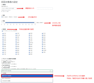 性別・年齢・居住地などの調査対象条件を設定します。