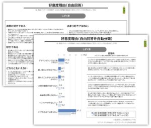 これらすべての工程を、ニーヨンでは自動化しています。当社独自の自動分類AI「コーディスト」を活用することで、好感度理由などの自由回答も、6〜24時間後にはグラフ化された状態でレポートに反映されます。