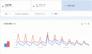 ・「家庭菜園(青)」「ガーデニング(赤)」が同じ線形(1年に1回、ゴールデンウィーク前後に山があり、この時期に検索される件数が増加する)